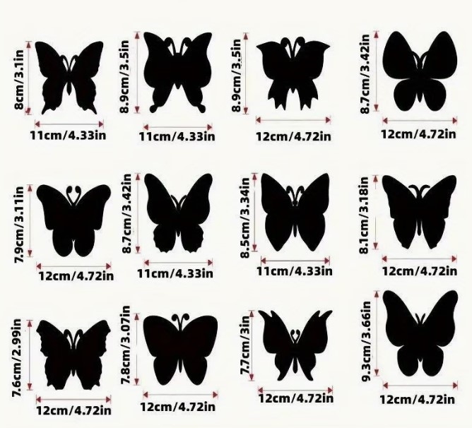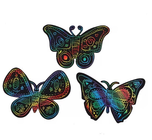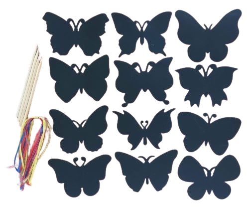12 skrabefigurer med sommerfugle + 4 skrabepenne og snore