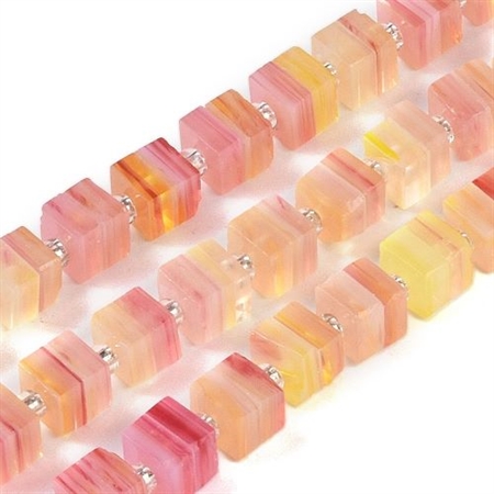 40 cm. håndlavede, gul/orange/rød, firkantede lampwork perler. 5,5 x 5,5 mm.