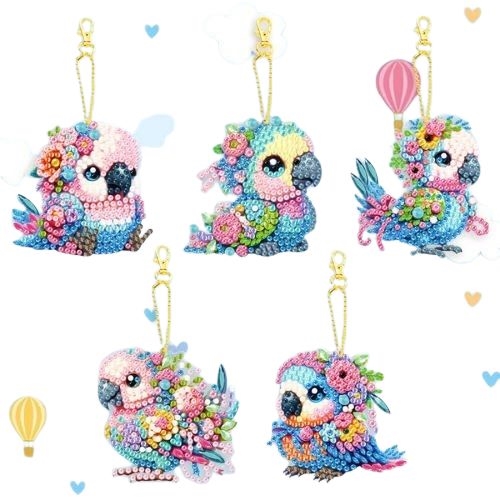 5 diamant nøgleringe med baby papegøjer