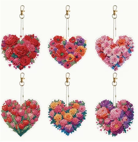 6 diamant nøgleringe med hjerter med blomster
